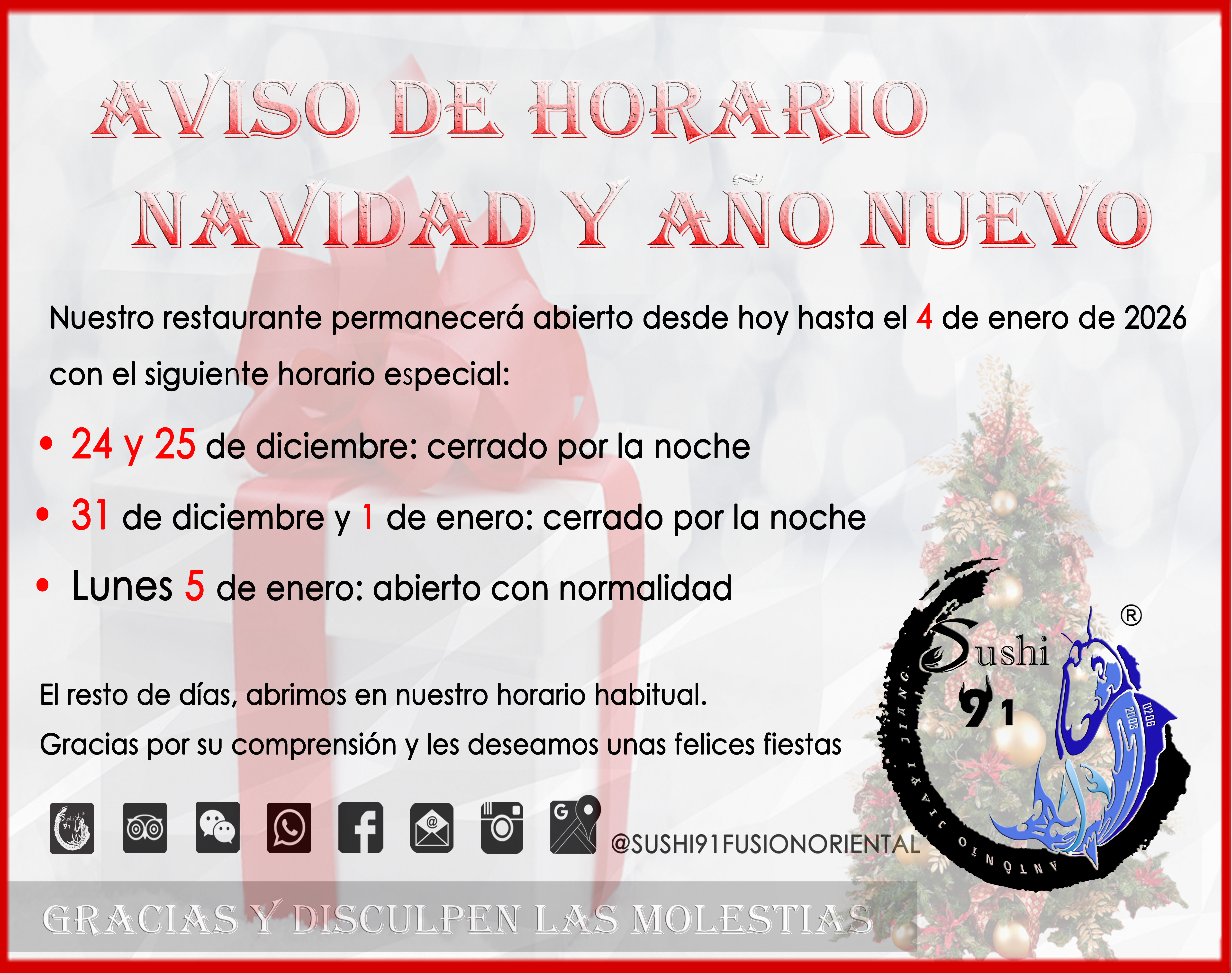 Te esperamos pronto en Sushi 91 Fusión Oriental, o si lo prefieres, también prestamos servicio a domicilo o de Catering (barcos de sushi).