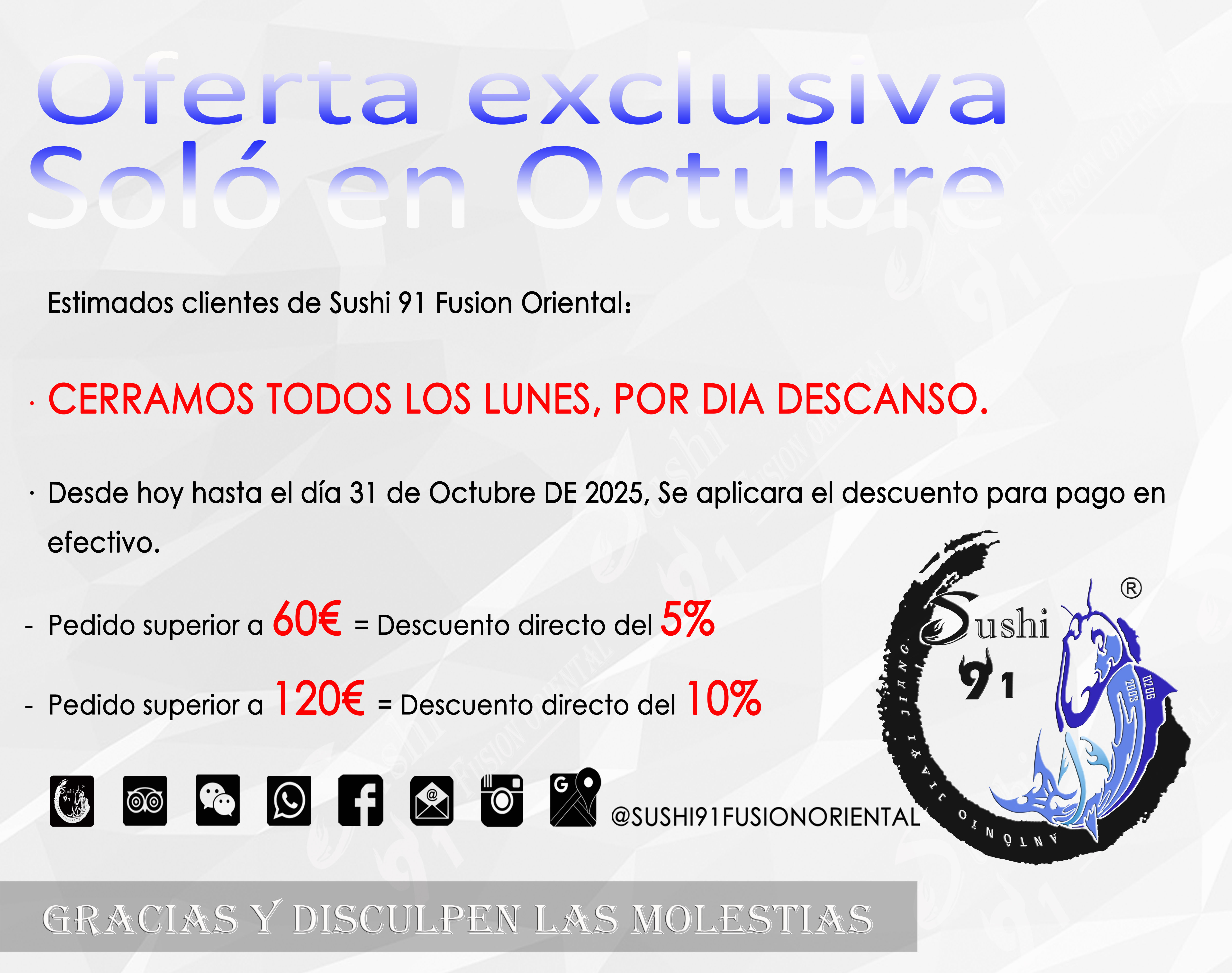 Te esperamos pronto en Sushi 91 Fusión Oriental, o si lo prefieres, también prestamos servicio a domicilo o de Catering (barcos de sushi).